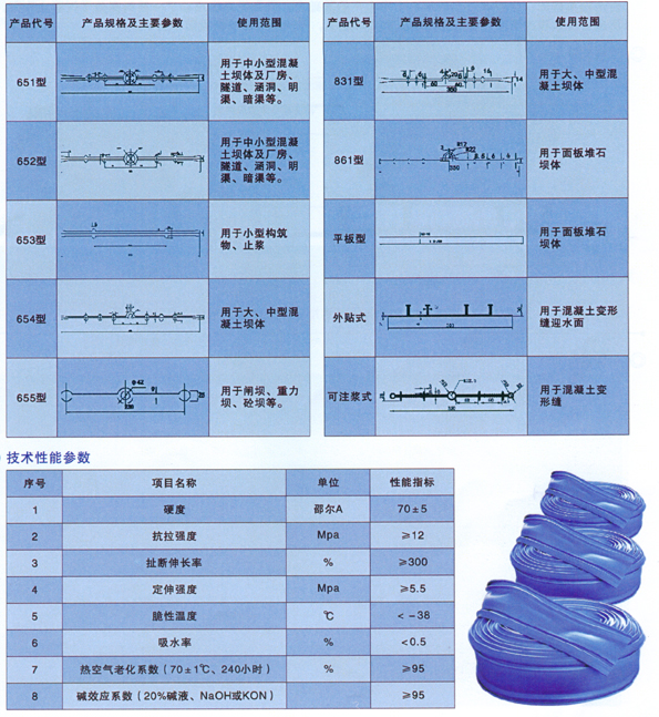 PVC、EVA塑料止水帶是由聚氯乙烯樹脂與各種填加劑,經混合、造粒、擠出等工序而制成的止水材料。PVC、EVA塑料止水帶該產品利用彈性體材料具有的彈性變形特性在建筑構造接縫中起到防漏、防滲作用,且具有耐腐蝕、耐久性好的特點。PVC、EVA塑料止水帶主要用于混凝土澆注時設置在施工縫及變形縫內與混凝土構成為一體的基礎工程。如隧道、涵洞、引水渡槽、攔水壩、貯液構筑物、地下設施等。